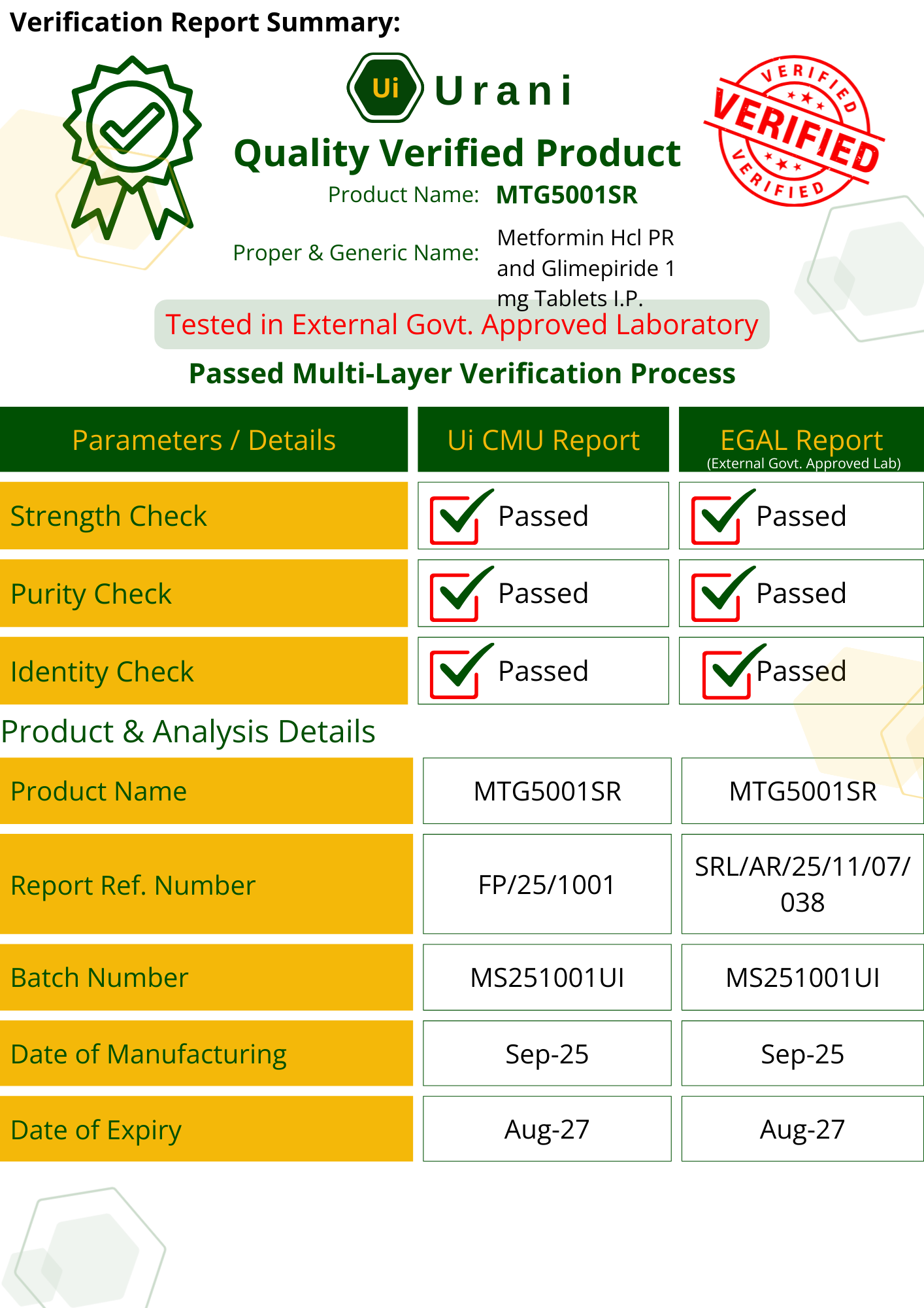 MTG5001SR - Metformin Hcl PR + Glimepride (500 mg +1 mg ) Tablets